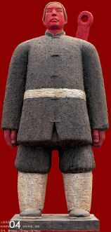 所以,刘若望再次面对历史时,就对雕塑有了不同的理解,他让“天兵”群像具有了内在的戏剧性。天兵来自民间神话的教谕,常常唤起无穷的畅想,将一切社会政治观念融入进去,天兵替天行道,天生具有合法地位;天兵,骁勇疆场,战无不胜;天兵,成为力量的象征,而天下,则成了天兵驰骋的疆域。于是,《天兵》被布局成一道视觉景观,艺术家曾经的梦想因此而得到实现,个体对历史的情结转化成公共的视觉在场,历史隧道就此打通,使观众有了身临其境的幻觉感。视觉由此通向触觉,青绿锈迹与斑驳土色产生考古的错觉,感性地拥抱了《天兵》指向的历史叙事。在此,一个新的力量象征诞生了。